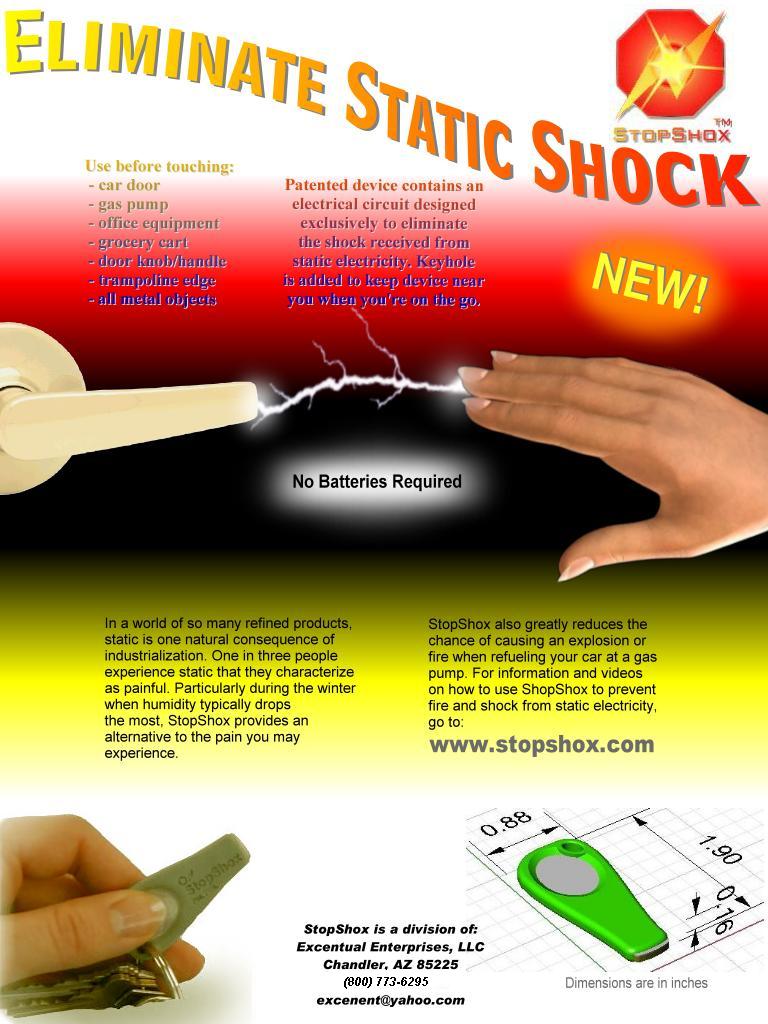 How to Prevent Shock This video demonstrates how to use StopShox™ to eliminate static shock. Windows video (*.avi; 484kB) Quicktime video (*.mov; 202kB) How to Prevent Shock from Car This video demonstrates how to use StopShox™ to eliminate the chance of being shocked when getting out of your vehicle. Windows video (*.avi; 834kB) Quicktime video (*.mov; 184kB) | ||||||||